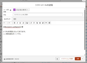 分譲オールワンでは、リストメール機能と言い、salesforceの標準機能でメールを複数の宛先に一斉送信することができます。