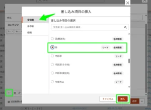 下の「{ }」(差し込み項目の挿入)ボタンをクリックし、受信者の中の「姓」を選択することで、受信者側には受信者の姓が表示されます。