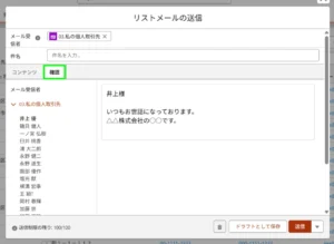 「確認」タブをクリックすることで、受信者側から見たメールをプレビューできます。